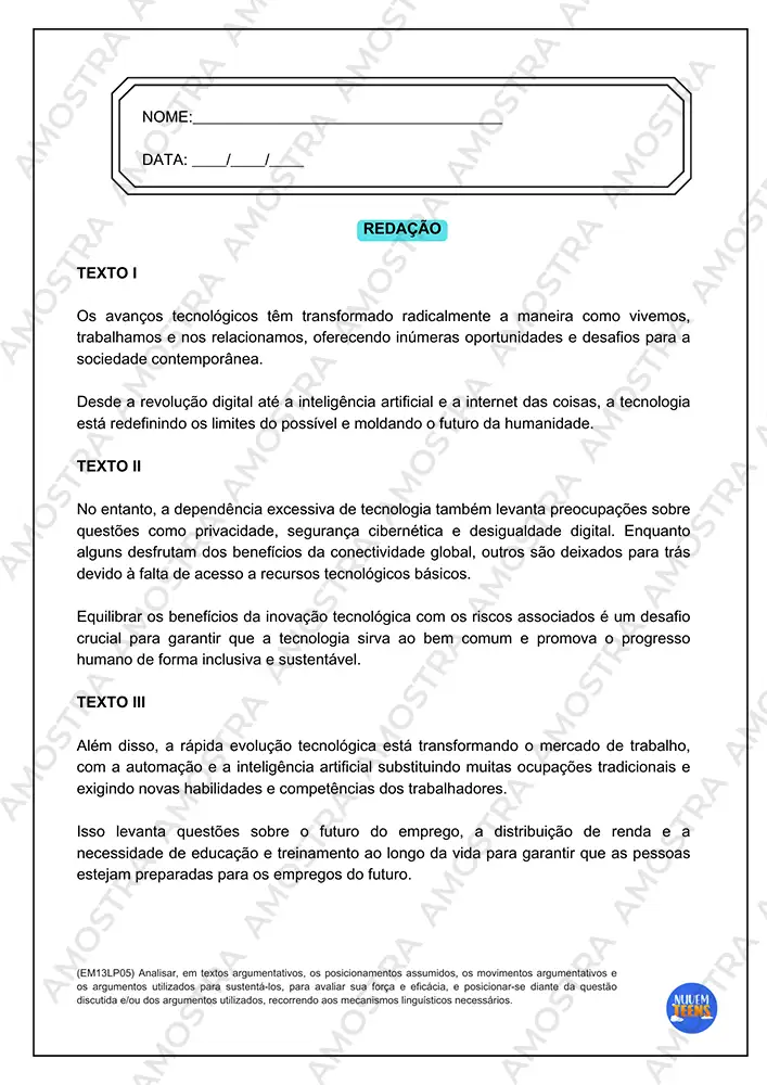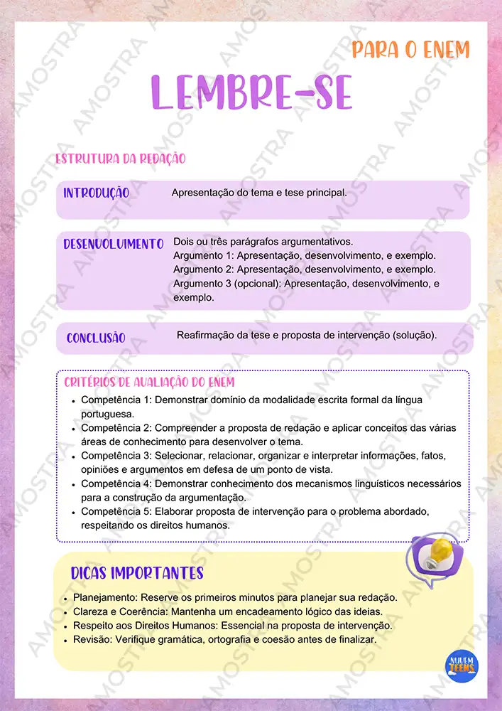 Com cabeçalhos totalmente editáveis em Word, textos explicativos que auxiliam no desenvolvimento dos temas e códigos da BNCC, esse material vai revolucionar sua forma de ensinar e avaliar redação nas suas turmas.